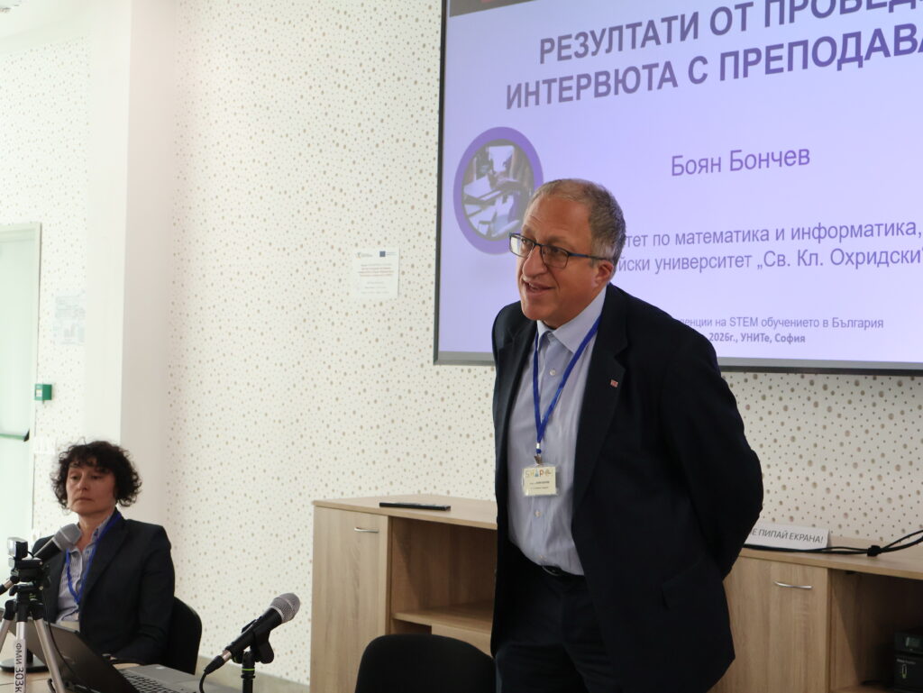Проф. д-р Боян Бончев от Факултета по математика и информатика на Софийски университет „Св. Климент Охридски“ представи резултатите от проведени интервюта с университетски преподаватели, насочени към анализ на състоянието и перспективите на STEM обучението.